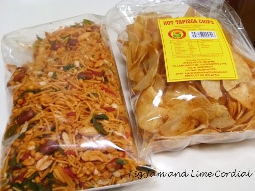 Asian junk food is quite irresistible – Malaysian tapioca chips and locally made bhuja mix – both hot and spicy. The red bits in the bhuja mix are slivers of dried chilli!