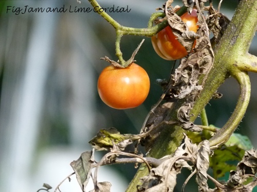 …a few self-sown plants appear to be wilt-resistant and have produced fruit despite the cold weather. We’re busily collecting seed for next season before the winter chill does them in completely. All appear to be roma-cherry crosses, but each has produced slightly different fruit. The one below even had different shaped tomatoes on the one branch…