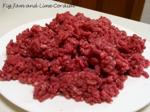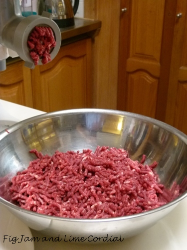 We bought a large rump piece – 5.4 kilos – and put it through our old Kenwood mincer. It was very reasonably priced at just $6.50 per kilo, but by the time I’d trimmed the fat off fairly obsessively, we were left with under four kilos of meat.