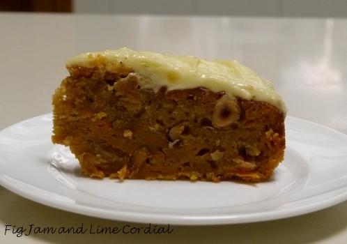 I baked the cake in a springform 20cm (8 inch) pan instead of the 18cm one specified, which meant the finished cake was a little flatter than expected. I also coarsely grated the carrots – the original recipe called for them to be finely grated, but I didn’t have the patience – and added a little lemon juice to the icing to balance out the butter and cream cheese.
