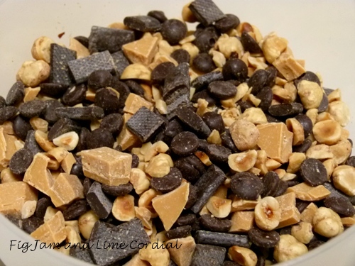 I used five types of chocolate in the recipe – Callebaut 70%, 54%, 44%, Dutched cocoa, and caramelised white chocolate – a total of 620g in the eight inch slab. I was inspired by a recipe from Debbi Field’s Great American Desserts (the original recipe used white chocolate, dark chocolate, Brazil nuts and caramel). Please feel free to improvise as desired …