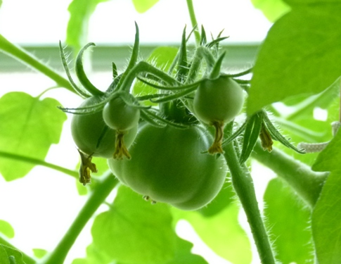 At the time we were hoping to overcome problems with verticillium wilt and fruit fly in the garden. But we were never confident that the plants would actually ripen indoors. A couple of weeks ago we had large, bright green toms that appeared to have stagnated.
