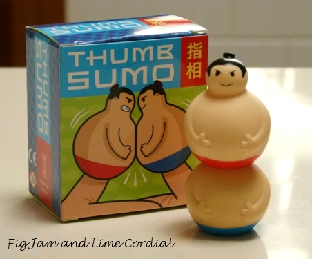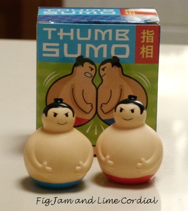 Thank you for the sumos darling – did you know that if you stack them like in the bottom photo, you can then squeeze the top one and shoot the bottom one across the room? ;-)