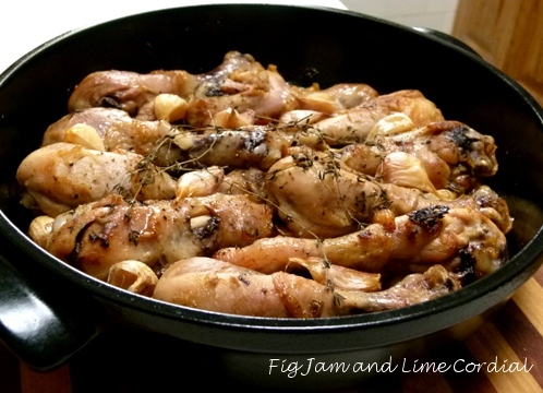 The chicken was browned in a little oil first, then laid over the chopped leeks, half of the unpeeled garlic cloves and a scattering of thyme leaves. The remaining cloves were scattered on top with a few sprigs of thyme, a couple of tablespoons of white wine and a light seasoning of salt and pepper. The pot was then covered with a tight fitting lid and baked in a 160C (with fan) oven for 1½ hours.