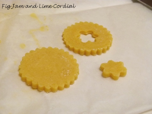 3. Preheat the oven to 170C (340F) or 150C (300F) with fan. Working with small portions of cold dough, roll the mixture out between two sheets of parchment to approximately 4mm (0.16″) thickness. Remove the top sheet and using a medium sized cookie cutter, cut out an equal number of biscuits. Then using a mini cutter, remove the centres of half of them.
