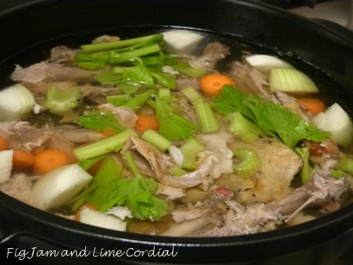 Last week, instead of discarding the skin and bones as I normally would, I decided to boil them up for stock. I didn’t actually think I’d get a lot more out of them, but I figured it was worth a try. I added a litre of water to the brasier, along with half a carrot, some celery, an onion and a couple of bay leaves. The pot was left simmering on the stove for a couple of hours, until it had reduced down to about a cup and a half of liquid…
