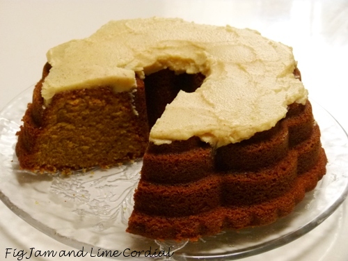 Here’s my latest attempt, a caramel cake with browned butter frosting. I baked it in a Wilton bundt pan, but given that the frosting was quite stiff and the batter reasonably sticky, it probably would have worked better in a 20cm (8″) springform pan.