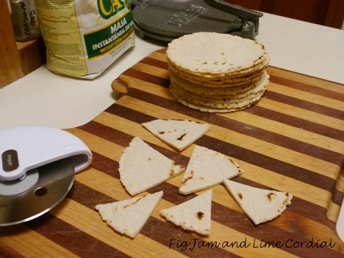 We began by making a batch of corn tortillas the day before. These were sliced into wedges…