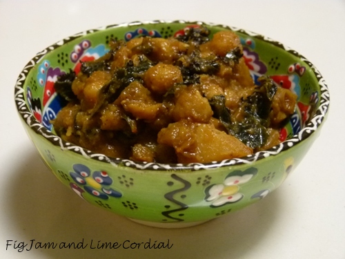 A chick pea, potato and purple kale curry, using a curry gravy base made according to The Curry Guy’s recipe…
