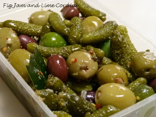 Lots of delicious food Celia! I love cornichons and have never paired them with olives before – looks great. Take Care.