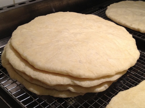Finally, we made and parbaked eight pizza bases for our neighbours Bernie and Jane. Making these at home is a doddle and sooo much cheaper than buying ready made – the bases work out at about 20c each, and freeze perfectly…