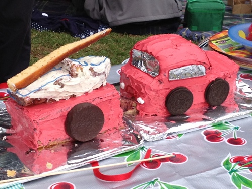We went to Little T’s 3rd birthday party, and his parents Will and Bethany created a bespoke cake to his detailed specifications…”I want a car cake with a trailer with a boat on it..”