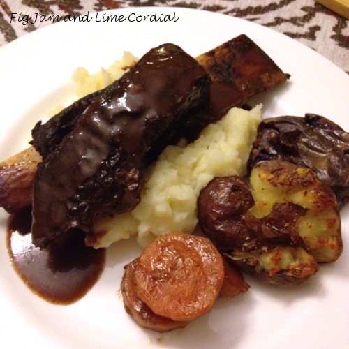Friday night, I cooked the last of my Cape Grim short ribs, following ChgoJohn’s fabulous recipe (thanks Charlie!). These were served on a bed of celeriac and potato mash, and accompanied with multi-coloured splats…