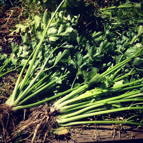 A large clump of self-sown celery was dug up, and divided into three smaller bunches for sharing…