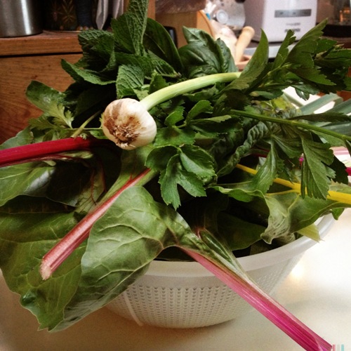 …are today’s garden pickings, including broccoli, kohlrabi, rainbow chard, celery, leek, basil, coriander, mint and fresh garlic. They all went into a Thai green curry for dinner…