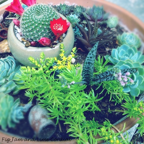 My lovely friend and neighbour Nic was so amused to find me lying on her lawn taking photos of her succulents, that she potted up some cuttings into a miniature garden for me. Over the past couple of months, they’ve thrived and grown into the gorgeous display above.
