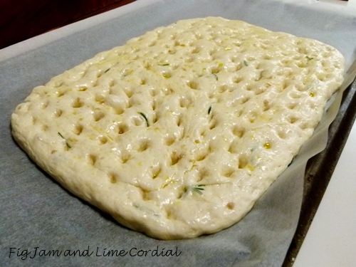 4. Preheat fan-forced oven to 240C (460F). Drizzle olive oil over the dough and spread it with your fingers, then scatter on the rosemary salt. Allow the dough to rest for a further 15 minutes or so while the oven heats up.