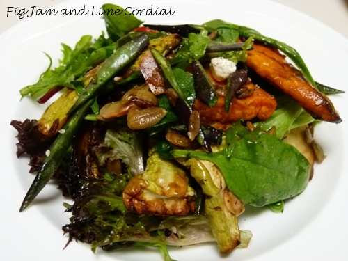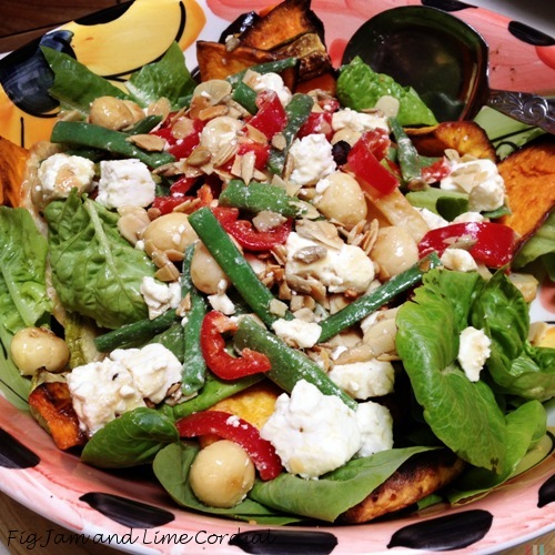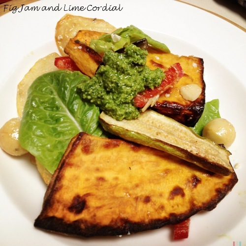 The vegetables were seasoned with sea salt and a little ground black pepper, then the nuts, feta and dressing were tossed through. We served the salad with a homemade basil and macadamia nut pesto…