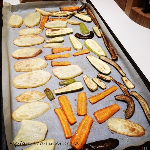 We began by slicing peeled potatoes, carrots, zucchini and eggplant (the latter two from our garden), tossing them in a little olive oil and salt, and roasting them in a 200C fan-forced oven…
