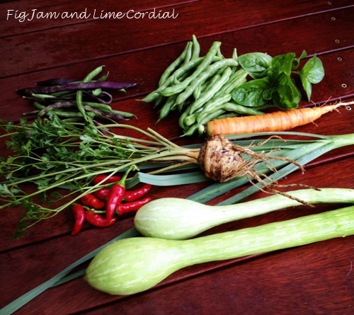 …but rather on our new outdoor table, are the pickings from last Saturday. It was raining heavily all day, but the vegetable crisper in the fridge was bare. So we rugged up in wet weather gear and went into the garden – as I said to Pete, “if we don’t pick, we don’t eat”.