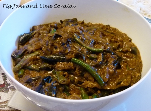 We fried the onion and garlic, then added the curry paste and fried it briefly before adding the chopped eggplant, beans and coconut milk. The curry was cooked until thick, and then seasoned with lime juice, sugar, soy and salt.
