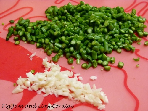 - beans (snake and purple), cut into 5cm/2″ lengths