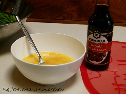 Three eggs were beaten with a splash of Teriyaki sauce (my mother uses the ubiquitous Maggi sauce)…