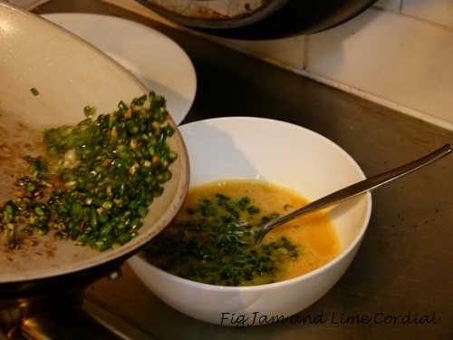 The beans and garlic are fried in a little oil, and then added to the egg mix…