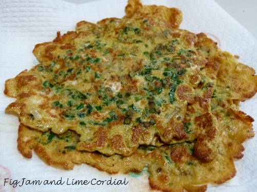 The mixture was ladled into the pan and cooked into flat omelettes. They’re supposed to be round. It’s worth tasting the first one, and adjusting the seasoning as required before cooking the remainder of the batter…