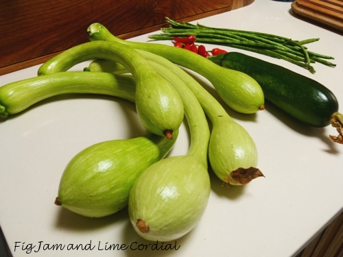 …are yet more tromboncinos, zucchini, chillies and snake beans from our garden…