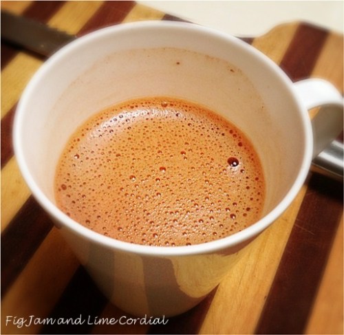 …is my latest breakfast pick-me-up – a chocolate shot made with 70% dark chocolate and boiling water, whizzed together. It keeps me going all morning!
