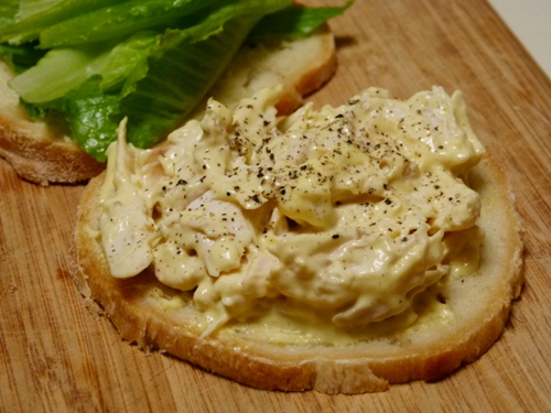 Inspired by a conversation I’d had recently with Lorraine, I used the loaf for chicken sandwiches, made with leftover poached meat from our simple soup recipe, a half batch of our speedy mayonnaise, a few leaves of homegrown cos lettuce and cracked black pepper…