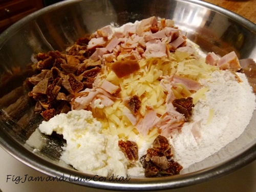 1. In a large mixing bowl, whisk together the flour, yeast and fine sea salt. Stir in the add-ins – I used grated hard cheeses (about 250g), chopped turkey breast (about 200g), half a cup of ricotta and eight dried figs, cut into pieces.