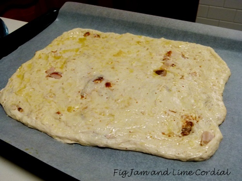 Our filled focaccia is a quick and easy way to use up bits and pieces in the fridge. It’s made with bakers yeast, which makes it a very quick dough, and one that can be thrown together on the spur of the moment. I’ll often make this when we have last minute guests for lunch.