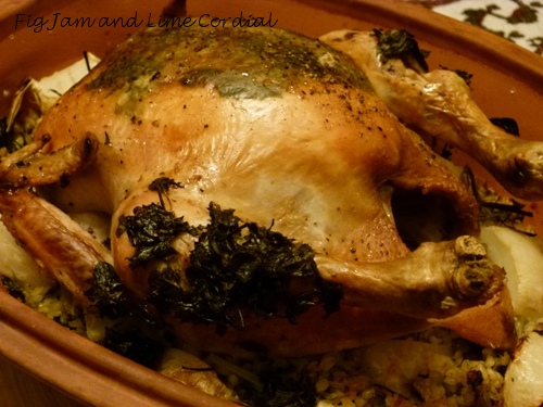 We got home just as the timer was going off! I removed the lid of the clay pot and allowed the chicken to brown up for a further 15 minutes before serving.