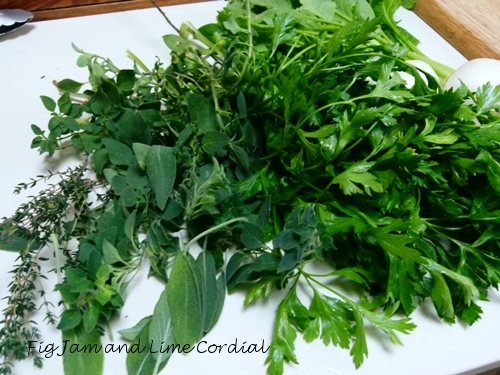 This recipe was inspired by Hotly Spiced’s Quick and Easy Herby Roast Chicken, although it’s not nearly as elegant as Charlie’s version. We started with a large pile of herbs from the garden – lots of parsley, a few sage leaves, thyme and plenty of oregano…