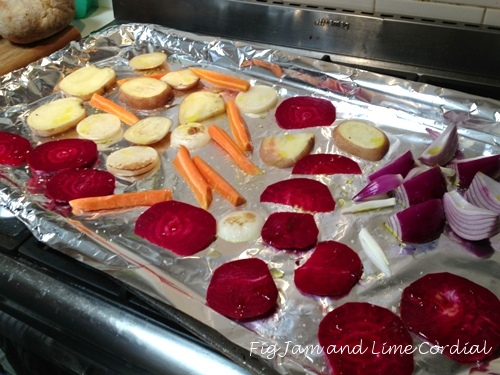 We sliced and microwaved a few potatoes, chopped up our last remaining Spanish onion, then tossed all the prepared veg in a little extra virgin olive oil and salt. It went into the oven to roast until everything was cooked through, then under the grill (broiler) briefly to crisp up and caramelise…