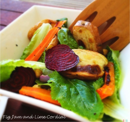 All the warm vegetables were combined with the Cos lettuce, turnip tops, beetroot leaves and a handful of roasted hazelnuts, then dressed with a mixture of red wine vinegar, a little olive oil and hazelnut oil.