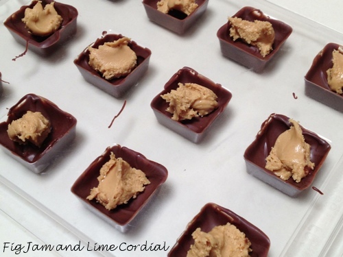 The moulds were set briefly in the fridge before a teeny spoonful of the peanut butter mixture was scooped into each cavity. We discovered that banging the trays on the bench helped to level off the peanut butter…
