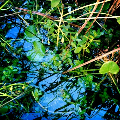 Claire, the pond is so full of plants that it’s hard to see the water these days. We used to have fish, but they all died off, and we didn’t replace them, as it seems to work well enough without them!