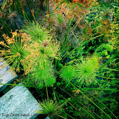 The Dwarf Papyrus plant is thriving, with its tufted pom-pom seed heads. Our neighbour Nic dries the flower stalks and then plaits them into handles for her baskets…