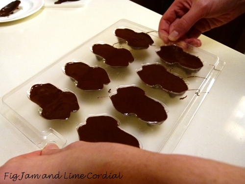 Step 10: Almost there! Once the chocolate has set on the saucer, ladle or spoon your tempered chocolate into moulds. Fill them about ¾ full, then bang the moulds on the table (carefully!) to settle and flatten out the chocolate. Pop the filled moulds into the fridge for ten minutes or so to set up…