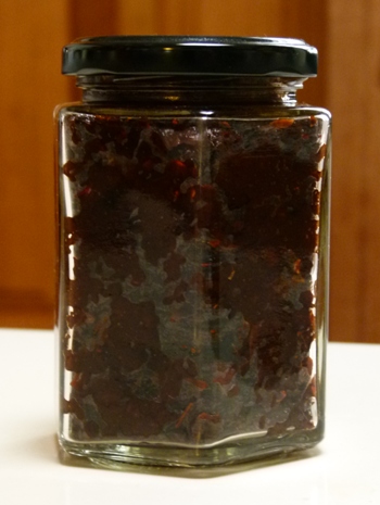 We omitted the garlic (at the time we didn’t have any fresh on hand), and the Mexican chillies we used gave the finished paste a slightly sweet, not overly hot, raisiny flavour. We stored it in a jar and stashed it in the fridge.