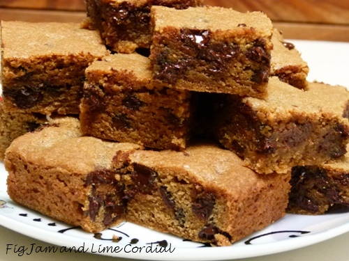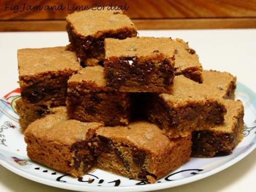 The end result, according to my boys, is halfway between a brownie and a cookie. It cuts well into squares or thin slices, as it’s reasonably firm in texture. It’s quite delicious, and was very popular when Pete’s family were here for the long weekend.