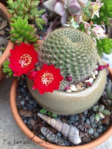 You sure have lots going on in your garden, where you are is it spring or summer? I am in the process of putting my garden to bed for the winter. Beautiful cactus, love that shade of red.