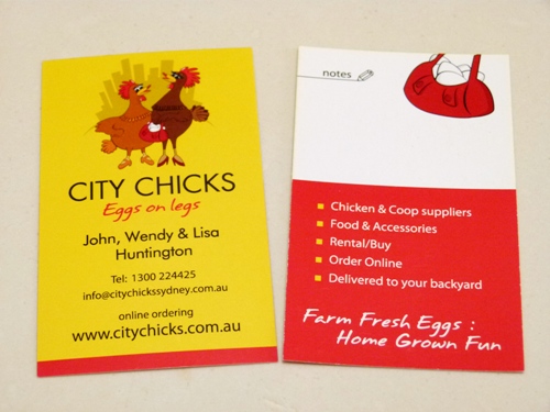 The Lohmann Brown chooks that we bought from City Chicks were $25 each, plus an extra $45 for delivery. That isn’t the cheapest price for layer hens, but we think it was well worth the extra cost to deal with a company who provides fabulous service and takes such loving care of their chickens. If you’re in Sydney and interested in having backyard chooks, John and Wendy’s contact details are on the business card below. City Chicks also has interstate branches which can be reached through their website.