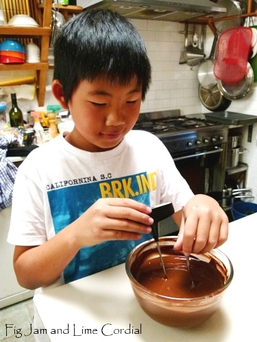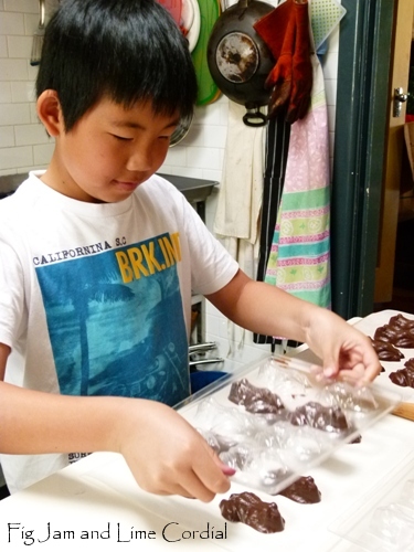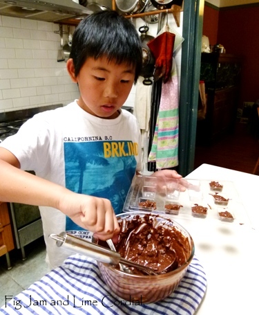 Celia- I always love your chocolate posts- the candy is beautiful and makes me drool with envy. But you have added a star to the posts now- not only is he cute and proficient- but he’s got that little smile that all good cooks have when their creation is coming to a very good completion! I love little boys- they are so much fun to spend time with in the kitchen!