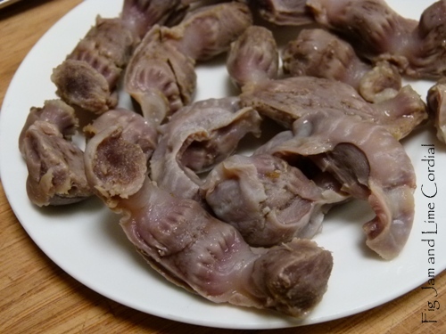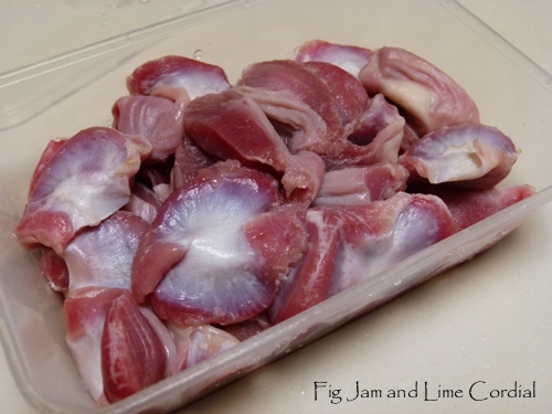 I rang my mother to ask her how to prepare them (apparently they’re quite a palaver to clean) and because she loves me, she came over a few days later with two boxes of carefully washed and trimmed pieces. I was too grateful to ask if they were free range, but somehow I doubt it – these are an extremely cheap chicken byproduct and therefore unlikely to be higher welfare…