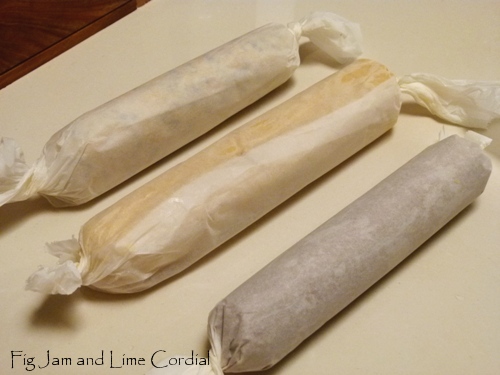 The first batch, which fed my craving for a good dunking bikkie, was a reworking of our gingernut recipe. Using the basic recipe, I shaped the dough into two logs, one of which went into the fridge (shown on the left in the photo below) and the other into the freezer for future baking …