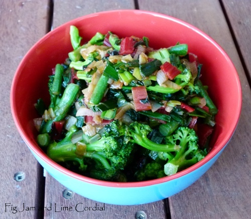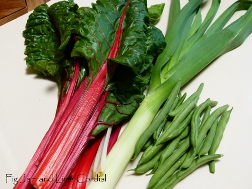 Late this afternoon, we brought in a large perennial leek, some rainbow chard, a few beans and a small mutant broccoflower head. All the veg were washed and chopped, then stir-fried with a couple of cloves of garlic, a splash of oyster sauce and a little sesame oil. It was a tasty accompaniment to the soy sauce chicken and rice we were having as our main meal…